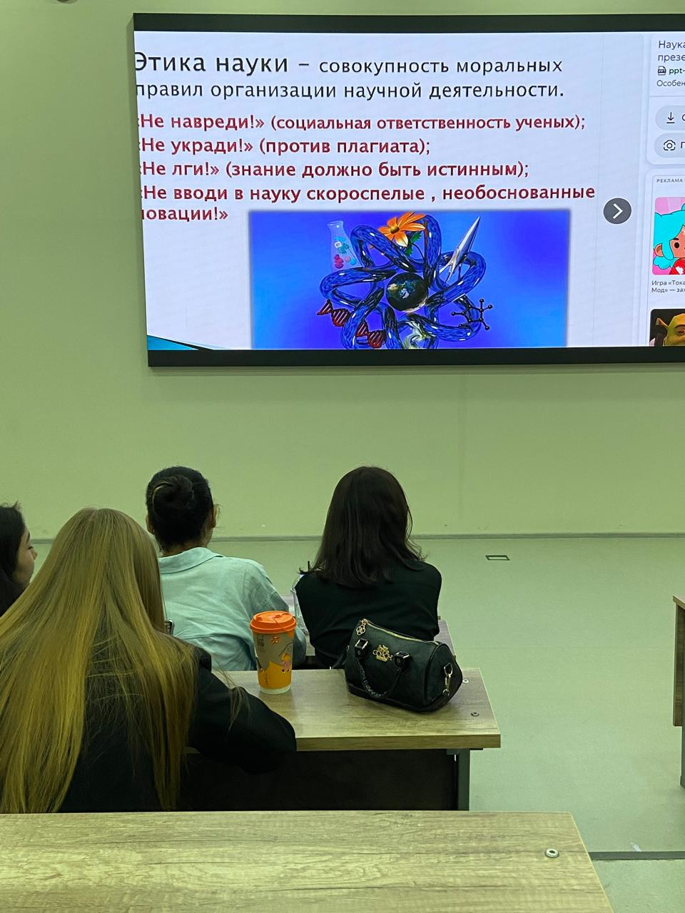 Кандидат филологических наук, доцент Марианна Юрьевна Андуганова и кандидат педагогических наук Светлана Валентиновна Владимировна поделились своим многолетним опытом в части руководства выпускными квалификационными работами и познакомили будущих молодых исследователей с основными этапами, которые необходимы при выполнении любого лингвистического исследования, также как и важно знать научную этику и этикет, которые держатся на нормах общечеловеческой морали: «не навреди», «не укради», «не лги».